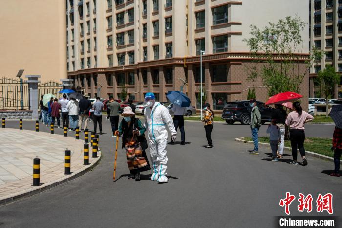 圖為8月12日,拉薩一小區(qū)內(nèi),工作人員攙扶藏族老人進行核酸檢測?!〗w波 攝