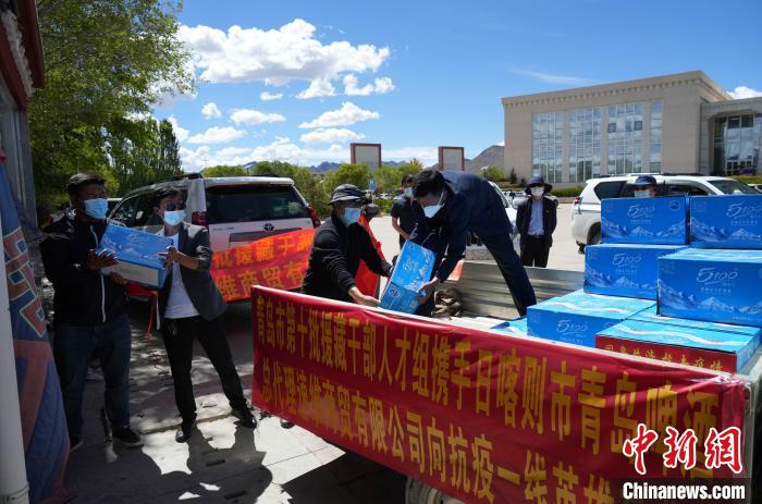 圖為青島啤酒集團(tuán)日喀則市總代理速維商貿(mào)向桑珠孜區(qū)捐贈(zèng)一批飲用水和飲料?!∏鄭u市第十批援藏干部人才組供圖