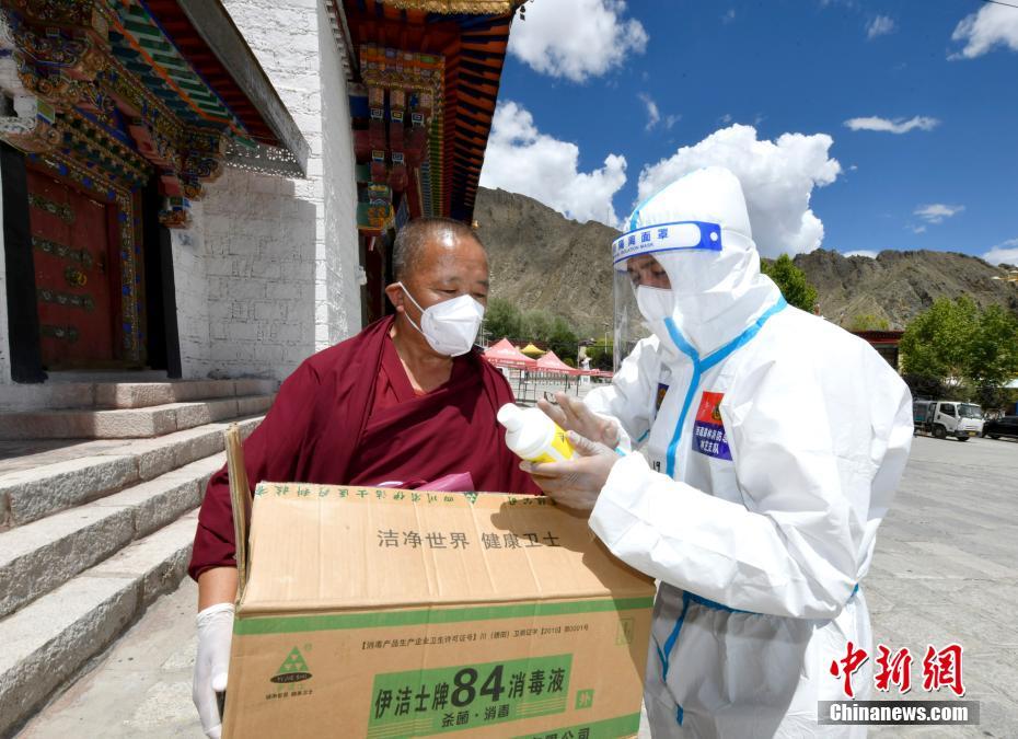 8月14日,西藏拉薩,志愿者為哲蚌寺送來防疫物資,并為僧人講解消毒液使用方法。當(dāng)日,拉薩市應(yīng)對新冠肺炎疫情工作領(lǐng)導(dǎo)小組決定,至8月15日凌晨3時(shí)的拉薩主城區(qū)消殺管理時(shí)間,再延長三天至8月18日凌晨3時(shí),在拉薩主城區(qū)以社區(qū)網(wǎng)格為基本單位,快速精準(zhǔn)開展多輪全員核酸篩查。 中新社記者 李林 攝