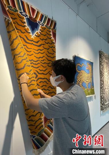 展廳中央地板上,90*190厘米的各色藏毯相連鋪開,這是藏族民眾最常用的、鋪在床鋪上的尺寸;兩旁墻上,懸掛多幅圖案復(fù)雜精細(xì)的大尺寸掛毯,這是重于藝術(shù)性的現(xiàn)代創(chuàng)作:好似唐卡的財(cái)寶天王掛毯、讓人有油畫錯(cuò)覺的珠穆朗瑪峰風(fēng)景掛毯……另有一張長逾1米的虎毯,主色深黃、虎紋考究,上下兩端織有七彩紋飾,非常搶眼。若將虎毯翻轉(zhuǎn),還會(huì)發(fā)現(xiàn)反面亦是清晰齊整的虎紋,與正面幾無差異。