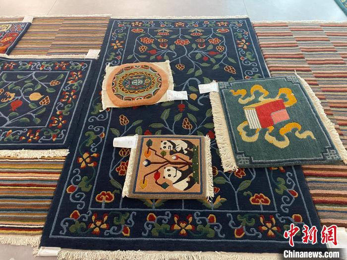 圖為展廳中展示的傳統(tǒng)藏毯及創(chuàng)新設(shè)計(jì)的坐墊大小的藏毯。李晗雪 攝