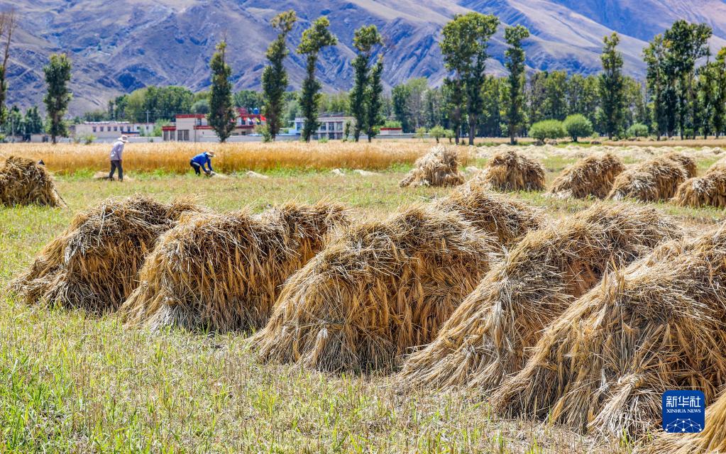 林周縣邊林鄉(xiāng)當(dāng)杰村玉沖組的村民在檢查收獲的小麥(9月6日攝)。新華社記者 覺果 攝