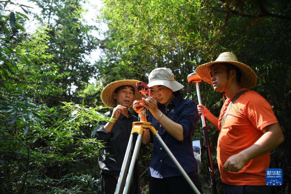 9月22日,在廣東韶關(guān)樂昌市張溪村的生態(tài)監(jiān)測(cè)樣地,白拉曲珍(中)和師傅江建發(fā)(左)、同事伍國(guó)清在操作設(shè)備。新華社記者 鄧華 攝