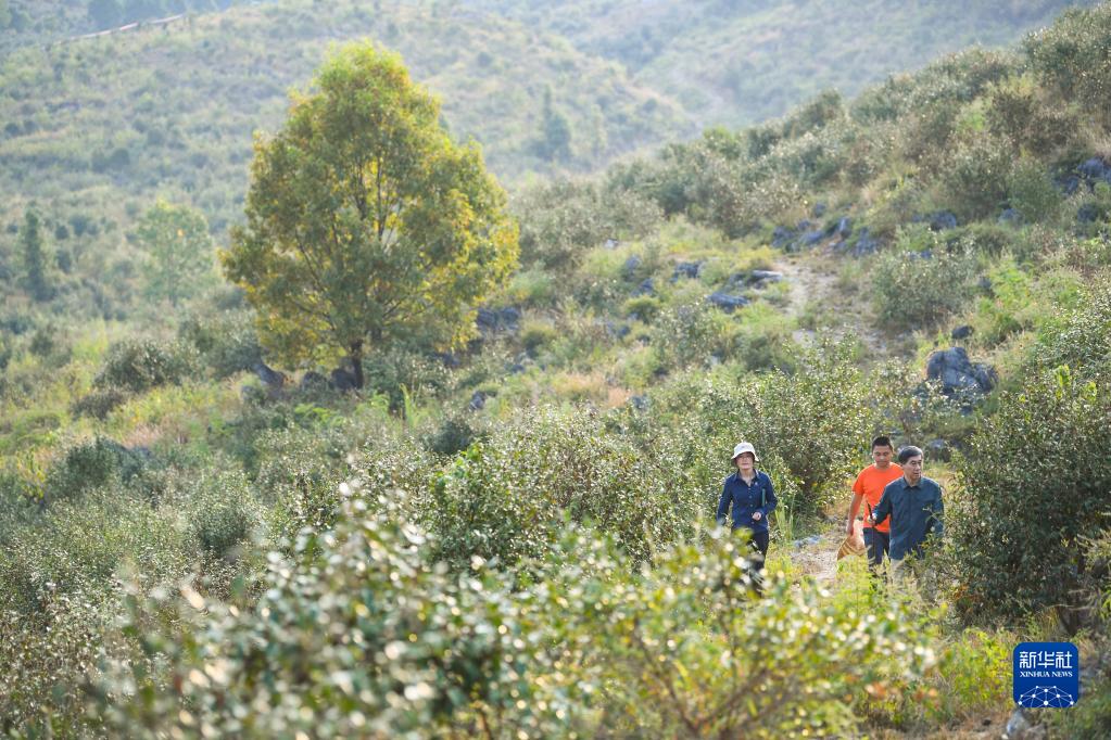 9月21日,在廣東韶關(guān)樂昌市梅花鎮(zhèn)流山村,白拉曲珍(左)和師傅江建發(fā)(右)、同事伍國(guó)清來到石漠化綜合治理的油茶種植基地查看油茶生長(zhǎng)情況。新華社記者 鄧華 攝