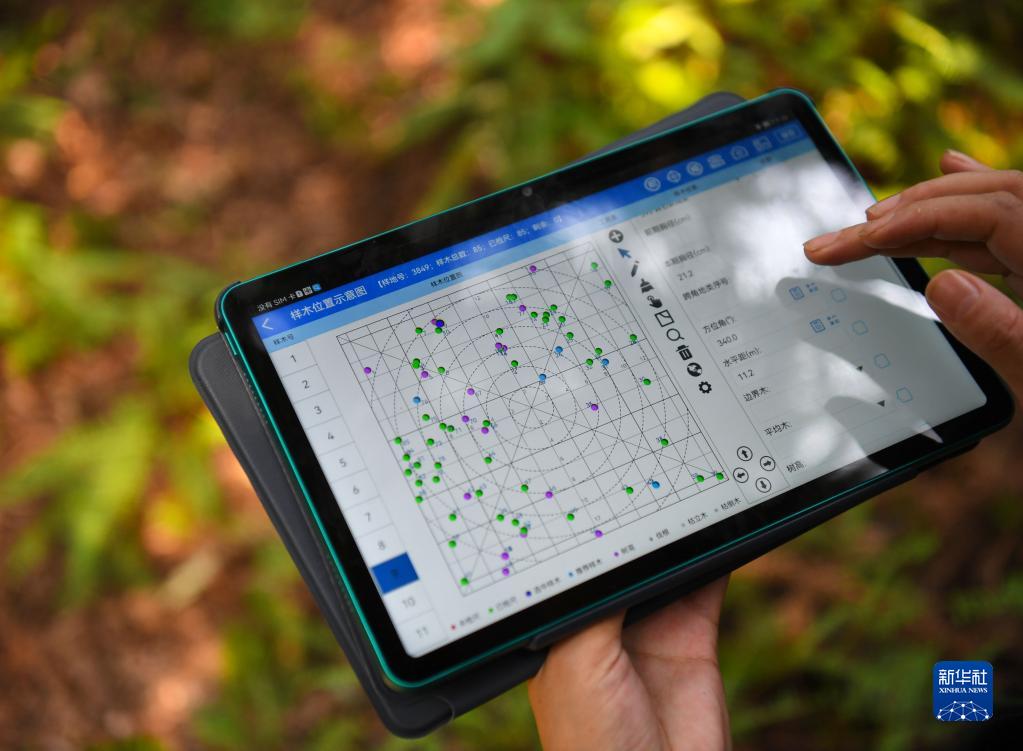 9月22日,在廣東韶關(guān)樂昌市張溪村的生態(tài)監(jiān)測(cè)樣地,白拉曲珍查看軟件數(shù)據(jù)。新華社記者 鄧華 攝