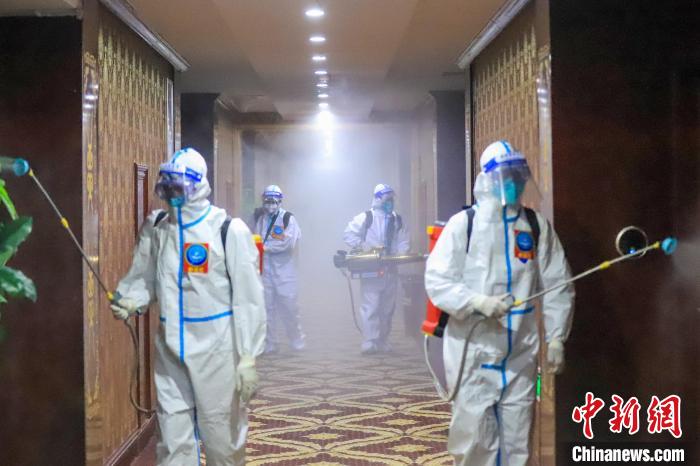 西藏森林消防隊員對隔離酒店進行覆蓋式消殺?!∥鞑厣窒揽傟?供圖