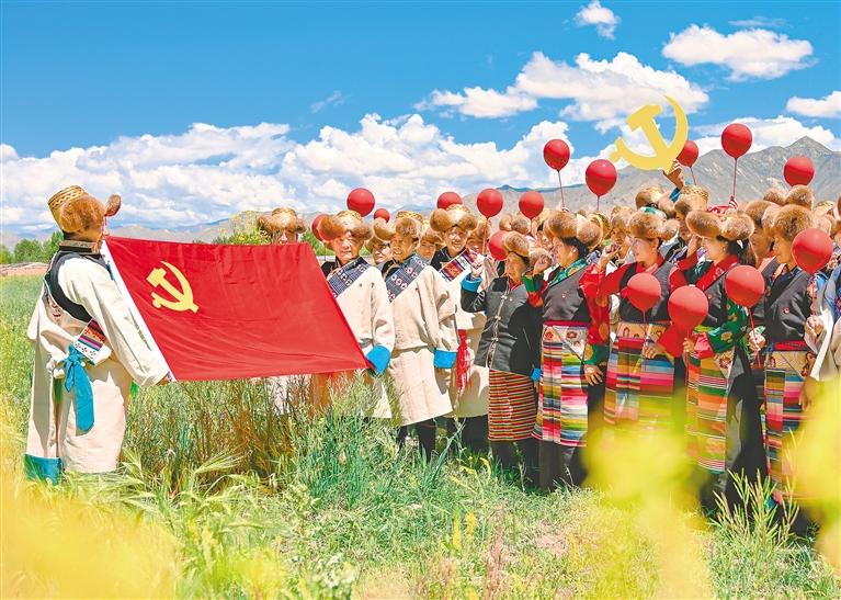圖為黨的光輝照邊疆、邊疆人民心向黨。各族群眾以淳樸而熱烈的形式表達自己的愛黨愛國情感。圖為2021年7月1日,西藏自治區(qū)貢嘎縣黨員開展慶祝中國共產(chǎn)黨成立100周年“永遠跟黨走”主題黨日活動。