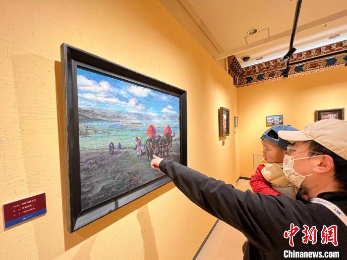 帶兒子一同前來參觀的向先生曾于2013年夏季到西藏旅游。他告訴記者,畫中的風(fēng)景、建筑和服飾非常寫實(shí);有關(guān)冬季的畫作彌補(bǔ)了他未見西藏冬日美景的遺憾。