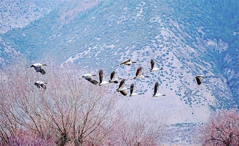 在林芝遷飛途中的黑頸鶴種群。圖由羅大慶提供