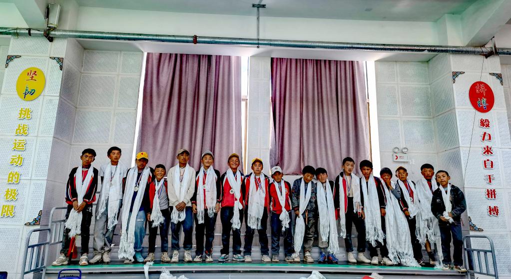 今年6月畢業(yè)前夕,格旦曲桑(前左)和同學(xué)在扎西宗鄉(xiāng)完全小學(xué)的足球場(chǎng)上合影留念