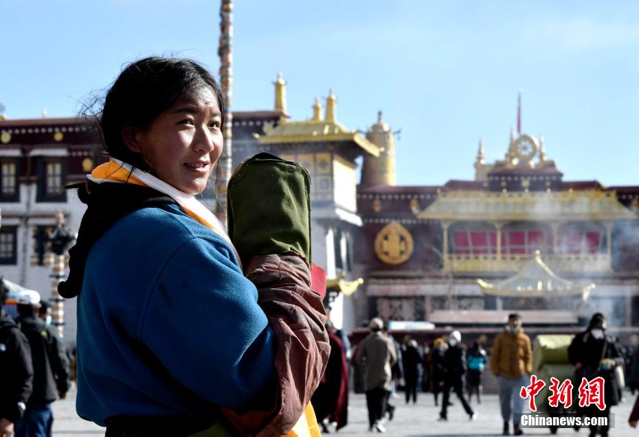 1月12日,西藏拉薩,來自青海玉樹的僧人們正在大昭寺前準備合影留念。 李林 攝