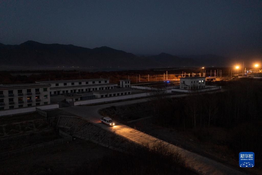 羅布和同事駕車(chē)駛出拉林鐵路扎囊工電綜合工區(qū),趕往鋼軌探傷作業(yè)點(diǎn)(1月12日攝,無(wú)人機(jī)照片)。新華社記者 孫非 攝