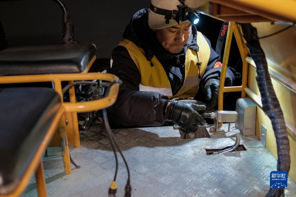 羅布和同事進(jìn)行鋼軌探傷前的準(zhǔn)備工作(1月12日攝)。新華社記者 孫非 攝