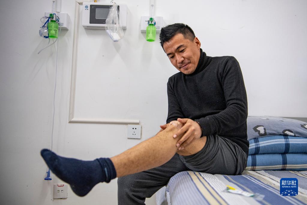 在拉林鐵路扎囊工電綜合工區(qū)的宿舍里,羅布給膝蓋貼膏藥。常年徒步進(jìn)行鋼軌探傷,羅布落下了膝關(guān)節(jié)半月板損傷的病癥(1月12日攝)。新華社記者 孫非 攝
