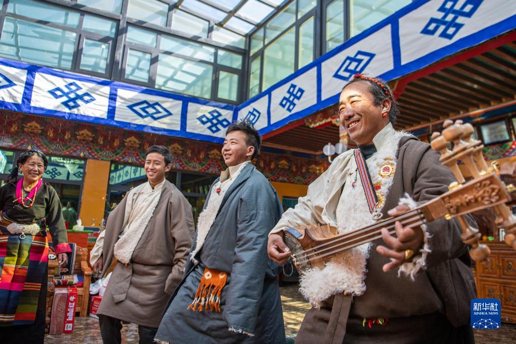 在西藏日喀則市芒普鄉(xiāng)普村的“村晚”現(xiàn)場,演員手持扎念琴準(zhǔn)備表演傳統(tǒng)節(jié)目(1月21日攝)。新華社記者 晉美多吉 攝