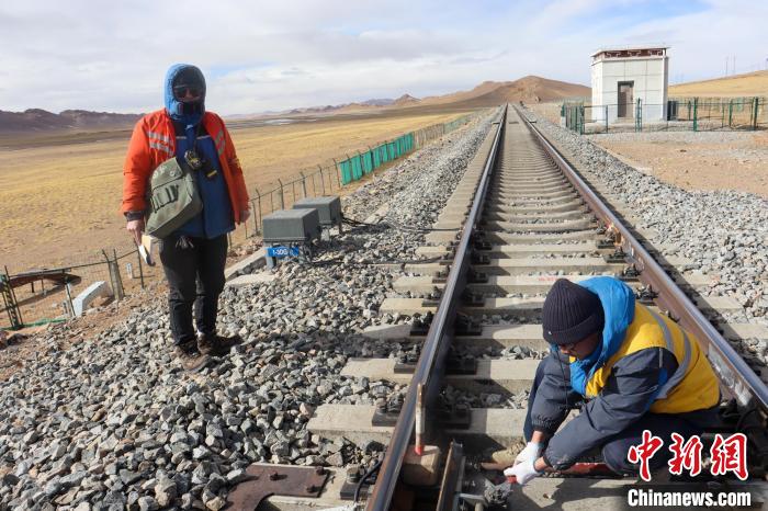 冬季西藏那曲寒風(fēng)凜冽,工長楊建青(右)加固道岔安裝螺絲?!●R生明 攝