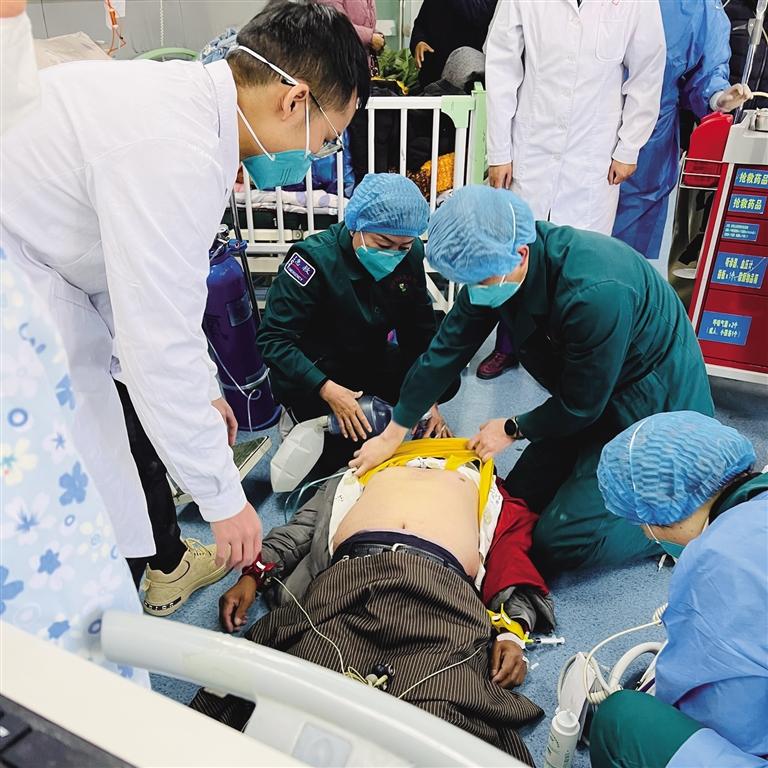 急診科值班醫(yī)生陳勝、副護(hù)士長(zhǎng)趙文熠等立即攜搶救車、除顫儀趕赴現(xiàn)場(chǎng),此時(shí),冬某意識(shí)喪失、頸動(dòng)脈搏動(dòng)消失、呼吸極其微弱。見(jiàn)患者病情危及生命,醫(yī)護(hù)人員立即實(shí)施搶救工作。急診醫(yī)護(hù)團(tuán)隊(duì)配合默契,胸外心臟按壓、球囊輔助通氣、建立靜脈通道、靜推腎上腺素、查心電圖、監(jiān)測(cè)生命體征、吸痰……一切有條不紊地進(jìn)行著。隨后,心電圖提示室顫,醫(yī)護(hù)人員立即予以非同步200J電除顫1次,待轉(zhuǎn)運(yùn)床到位后立即轉(zhuǎn)運(yùn)患者至搶救室進(jìn)一步救治,轉(zhuǎn)運(yùn)過(guò)程中心肺復(fù)蘇不間斷。