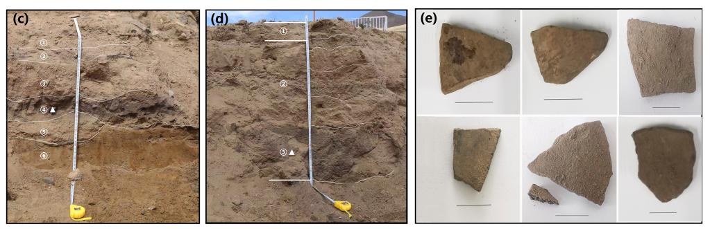 圖(c)(d)分別為共塘遺址調(diào)查剖面1和剖面2地層(三角形表示陶片位置)。圖(e)為本研究所分析的陶片照片。(資料圖片由第二次青藏科考隊(duì)“人類活動(dòng)歷史及其影響”分隊(duì)提供)