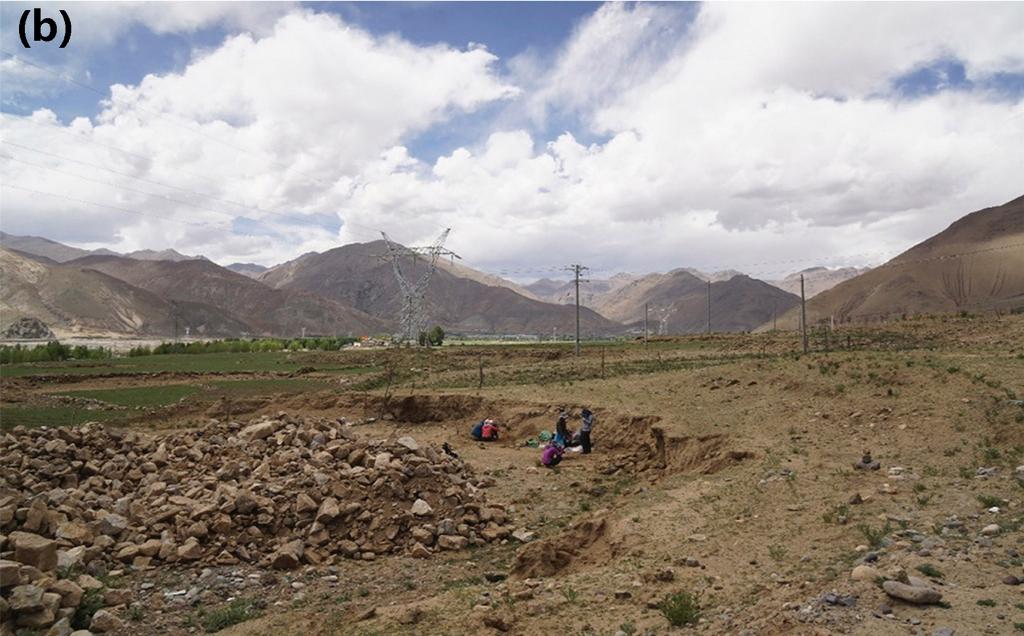 圖(b)為科考隊(duì)員發(fā)現(xiàn)共塘遺址后隨即進(jìn)行地層剖面清理和樣品采集。(資料圖片由第二次青藏科考隊(duì)“人類活動(dòng)歷史及其影響”分隊(duì)提供)