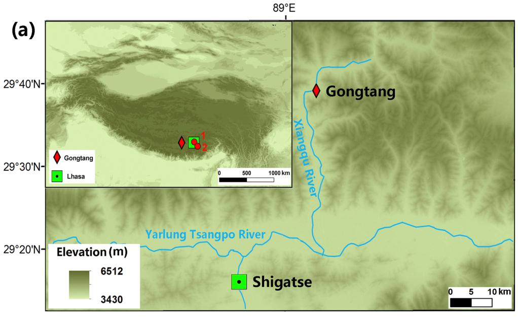圖(a)為雅魯藏布江中游部分地區(qū)遺址背景資料圖,曲貢(1)、邦嘎(2)和共塘遺址位置(紅色菱形所示)。(資料圖片由第二次青藏科考隊(duì)“人類活動(dòng)歷史及其影響”分隊(duì)提供)