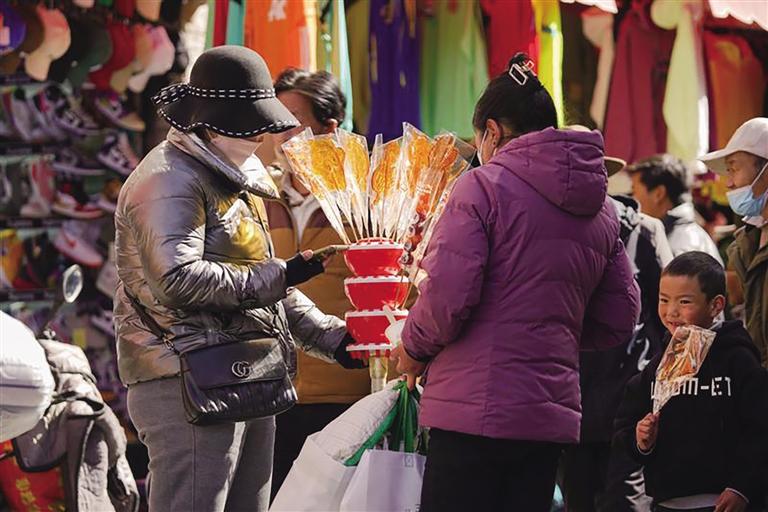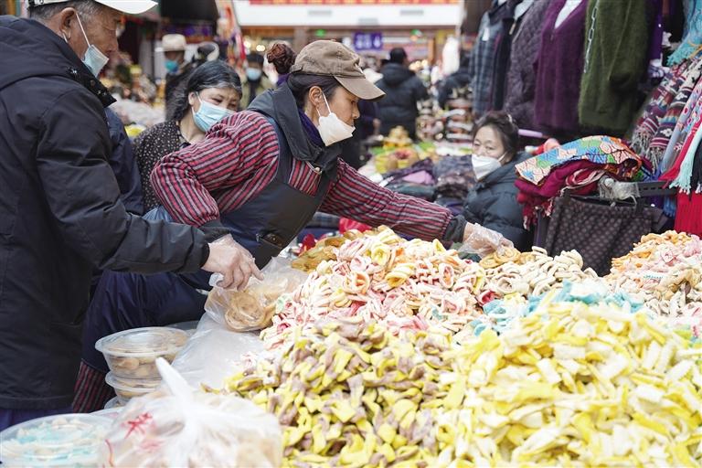 “市場現(xiàn)有1200多家商戶,經(jīng)營商品有零食、蔬菜、肉類、干雜、五金、服裝等。藏歷新年臨近,每天前來置辦年貨的市民絡(luò)繹不絕,日均人流量超1萬。為保證藏歷新年期間年貨充足,市場商戶們提前籌備、積極備貨,目前,各類商品庫存充足、品種豐富,基本上能夠滿足不同消費(fèi)者的需求?!睕_賽康商貿(mào)有限公司負(fù)責(zé)人尼瑪告訴記者。此外,沖賽康市場將于2月19日至27日暫停營業(yè),28日起正常營業(yè)。