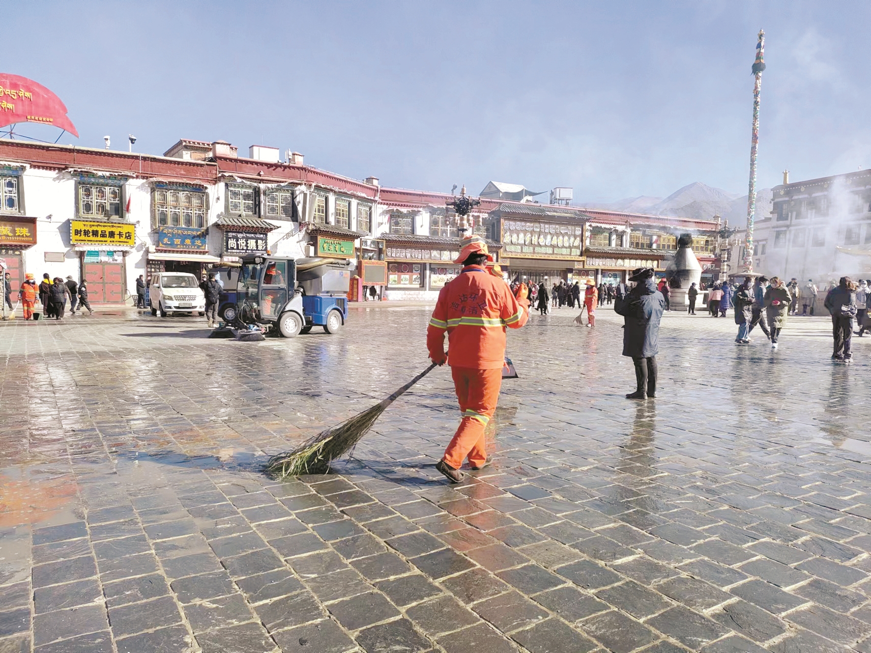圖為博瑞環(huán)衛(wèi)服務(wù)有限公司環(huán)衛(wèi)工人對大昭寺廣場進行清掃、沖洗。 拉薩融媒記者 李從芳攝