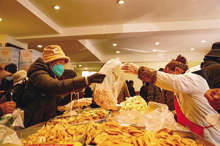 2月13日,記者走進(jìn)位于拉薩市林廓北路的龍?jiān)隹ㄈ?,香味撲鼻而來,不同樣式的卡塞被整齊地?cái)[放在貨架上,引得不少市民前來詢價(jià)購買?!拔覀兪沁@家店的老顧客了,每逢過年都會(huì)來店里購買卡塞,今年我準(zhǔn)備一次性買五六斤,讓家人吃得開心?!笔忻裨髯楷斦f,“以前我們都是自己炸卡塞,現(xiàn)在沒時(shí)間做了,就來市場(chǎng)上買現(xiàn)成的。這家店制作的卡塞不僅樣式好看,味道也不錯(cuò),家人很喜歡,而且到店還能看到制作過程,對(duì)食品安全也比較放心?!?/p>