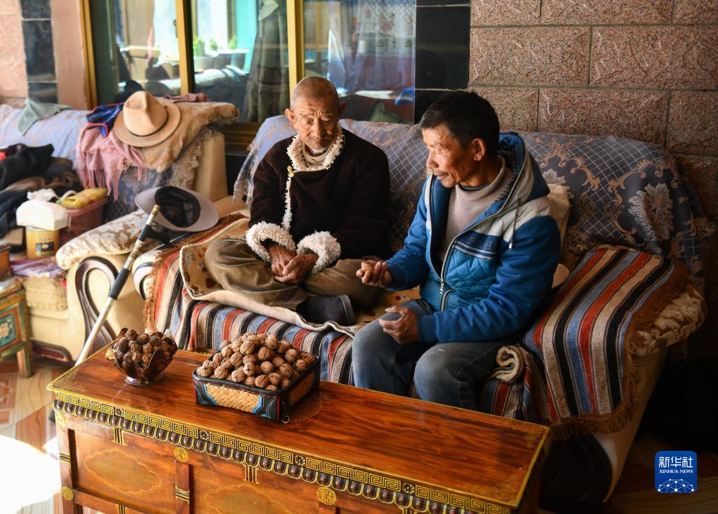山南市加查縣拉崗村的村民在核桃樹下聊天拉家常(2月1日攝)。新華社記者格桑邊覺 攝