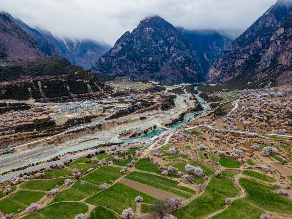 在西藏那曲市嘉黎縣尼屋鄉(xiāng)拍攝的桃花(無人機照片,2022年3月21日攝)。新華社記者周荻瀟 攝