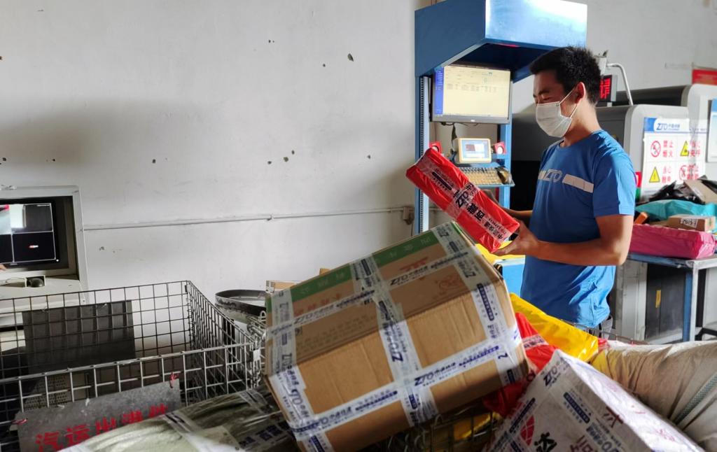 工作人員在日喀則市中通快遞網(wǎng)點分揀包裹。新華社記者劉洲鵬 攝