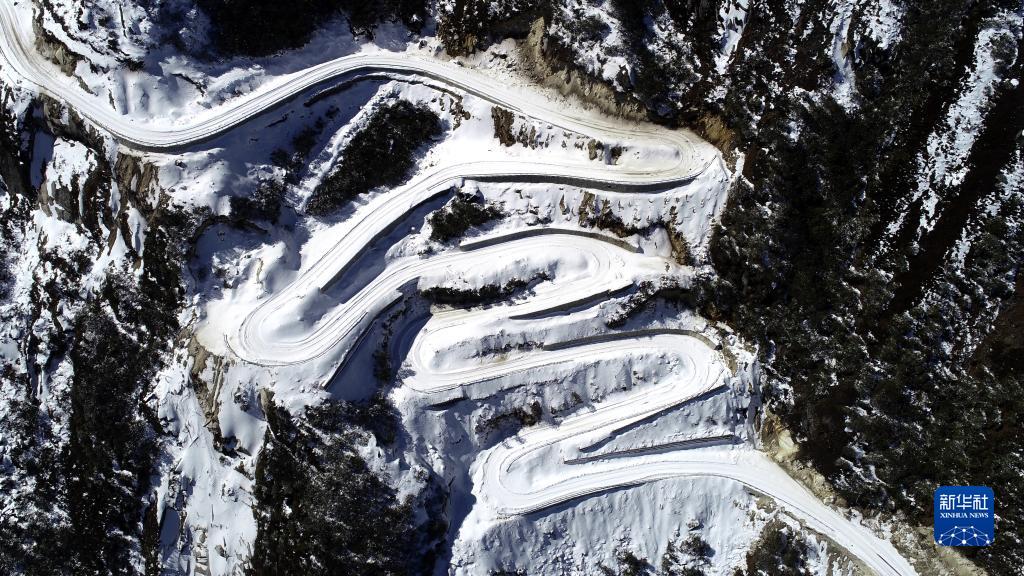 西藏洛扎縣境內懸崖峭壁間的通村公路(2022年1月17日攝,無人機照片)。新華社記者韓曦樂 攝