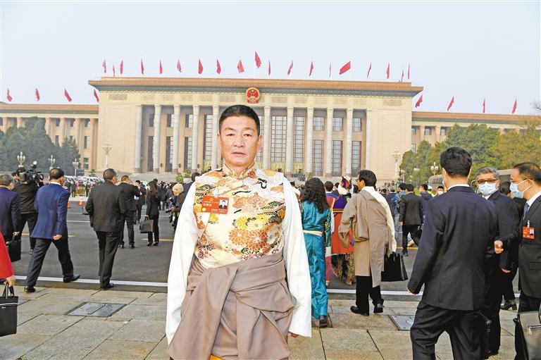 圖為全國(guó)人大代表扎西尼瑪在人民大會(huì)堂前拍照留念。記者 李洲 攝