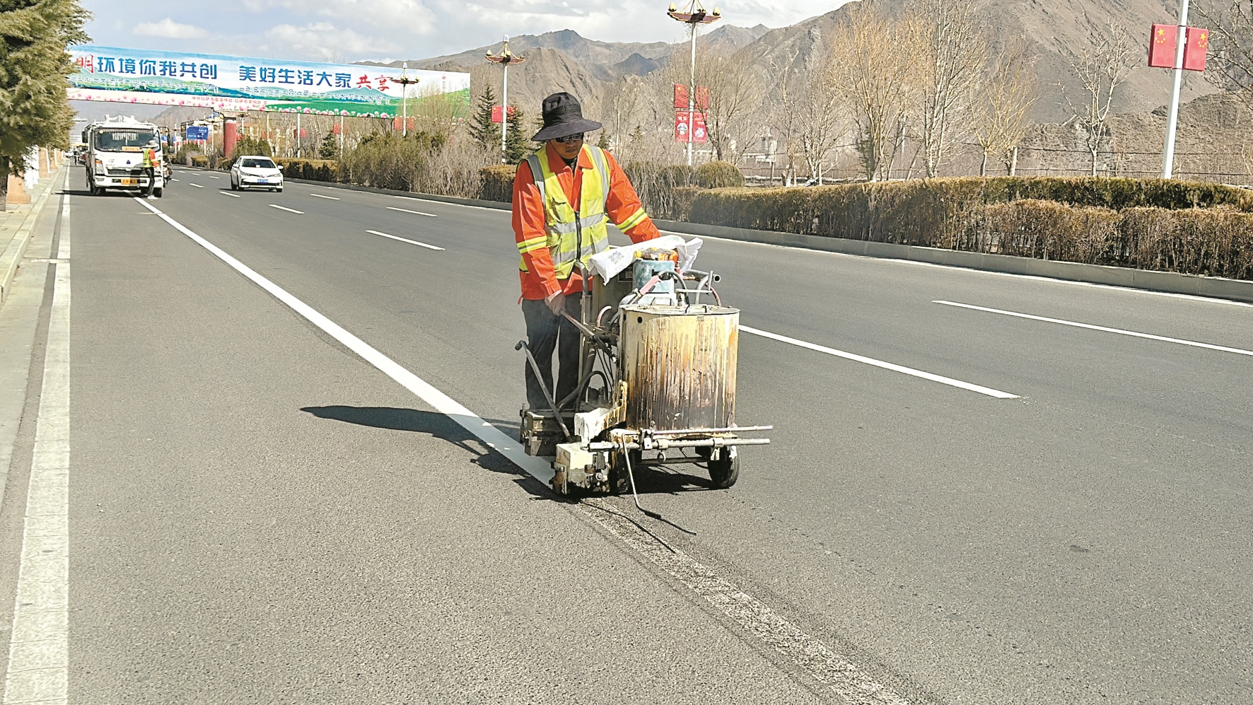 圖為工作人員正在南環(huán)318沿線施劃交通標線。 拉薩融媒記者 左曉萌攝