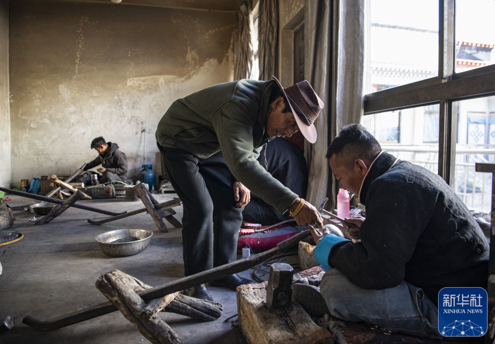 在扎西吉彩金銀銅器廠(chǎng),廠(chǎng)長(zhǎng)拉巴瓊達(dá)(前左)在指導(dǎo)年輕的手工藝人(3月9日攝)。