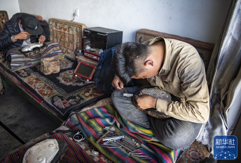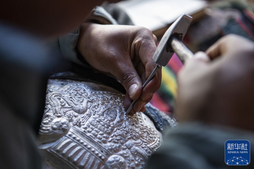 在扎西吉彩金銀銅器廠(chǎng),手工藝人在給銀器鏨刻花紋(3月9日攝)。