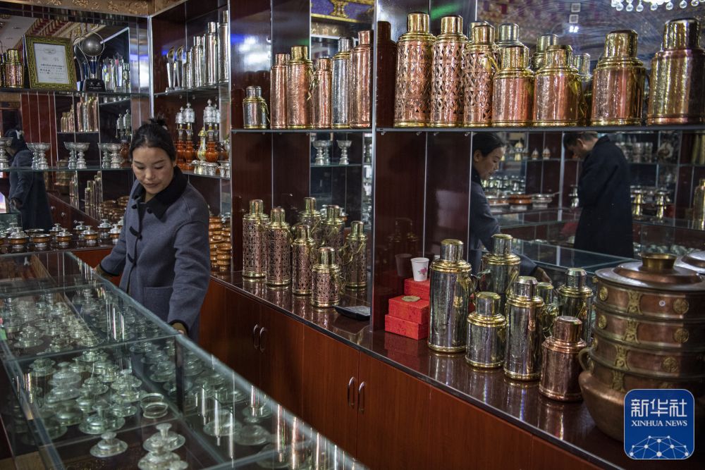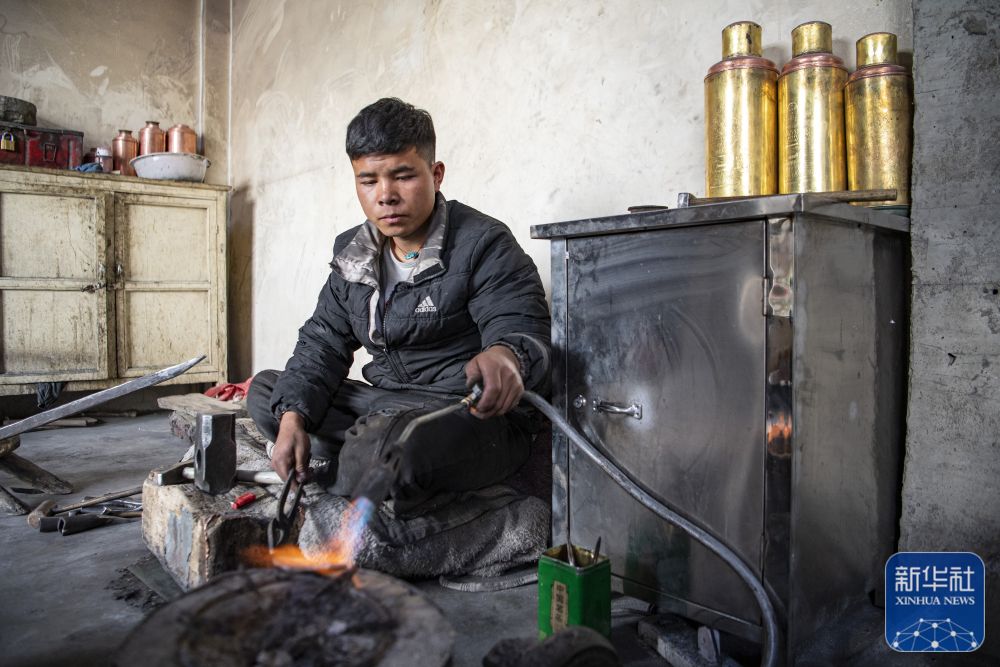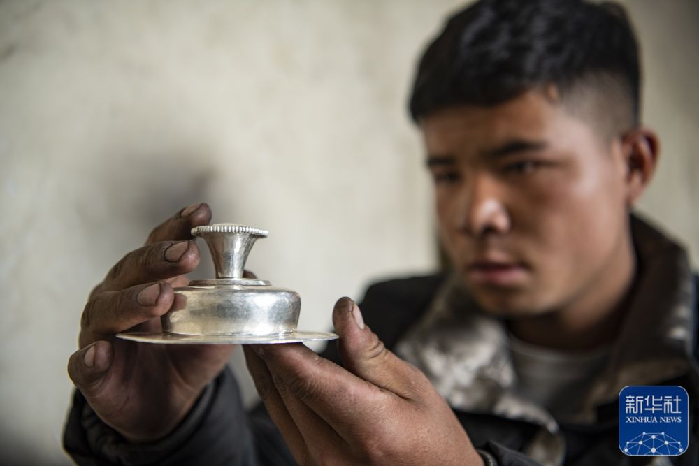 在扎西吉彩金銀銅器廠(chǎng),一位手工藝人在檢查自己打制的銀器坯子(3月9日攝)。