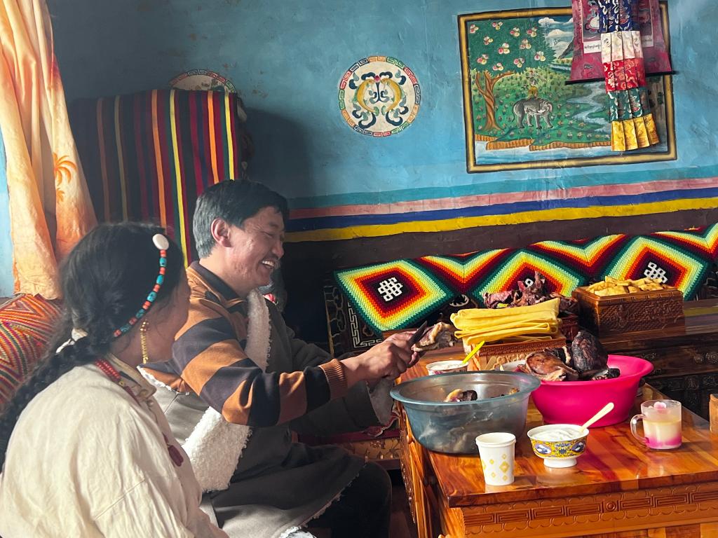 增措的丈夫娃布正在切肉(2023年3月8日攝)。新華社記者 格桑邊覺(jué) 攝