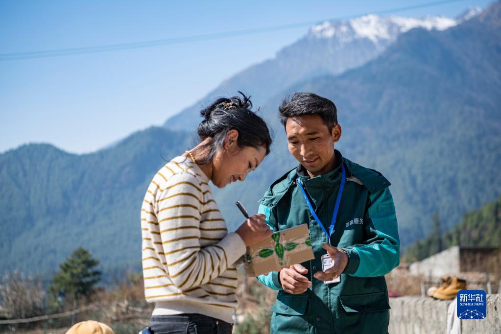 3月12日,在西藏吉隆縣沖色村,巴桑頓珠正在派件。新華社記者 孫非 攝