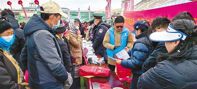 山南市錯(cuò)那縣“鑄牢中華民族共同體意識(shí) 慶祝西藏百萬農(nóng)奴解放紀(jì)念日”活動(dòng)現(xiàn)場(chǎng),各宣傳點(diǎn)給群眾發(fā)放宣傳資料。記者 旦增蘭澤 攝