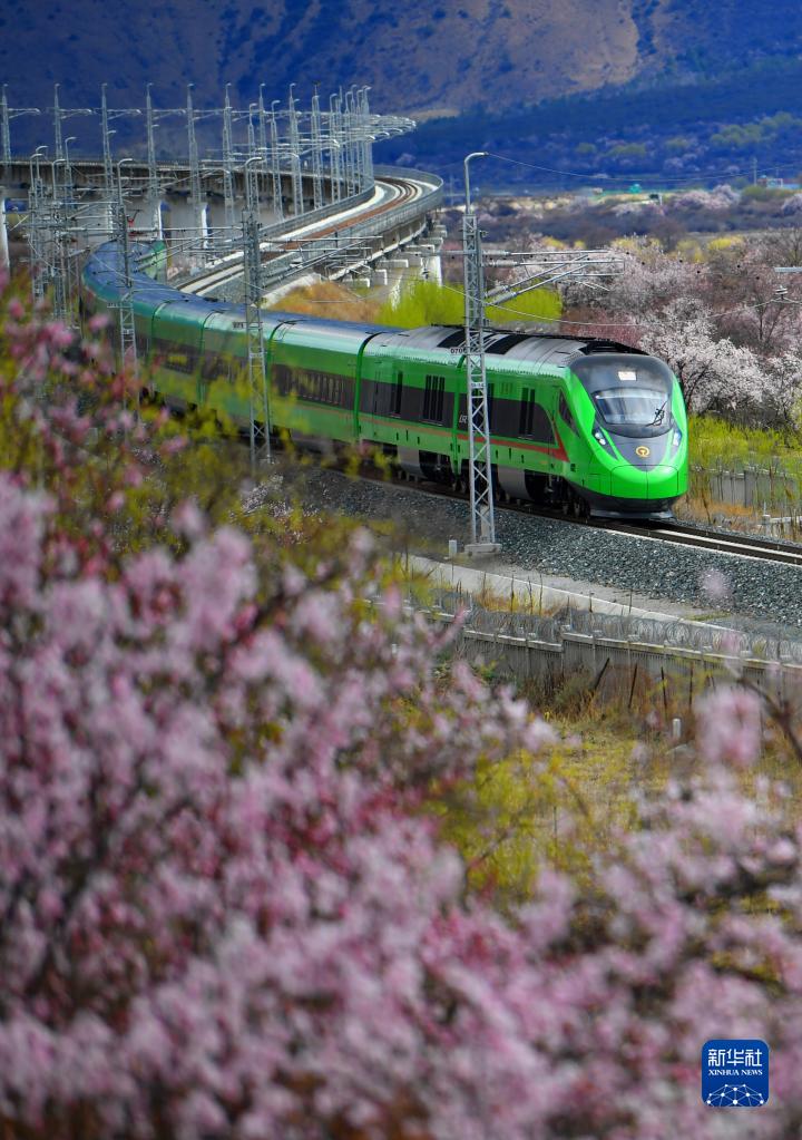 復(fù)興號穿行在西藏拉林鐵路林芝段的桃花間(2023年3月21日攝)。新華社記者 覺果 攝