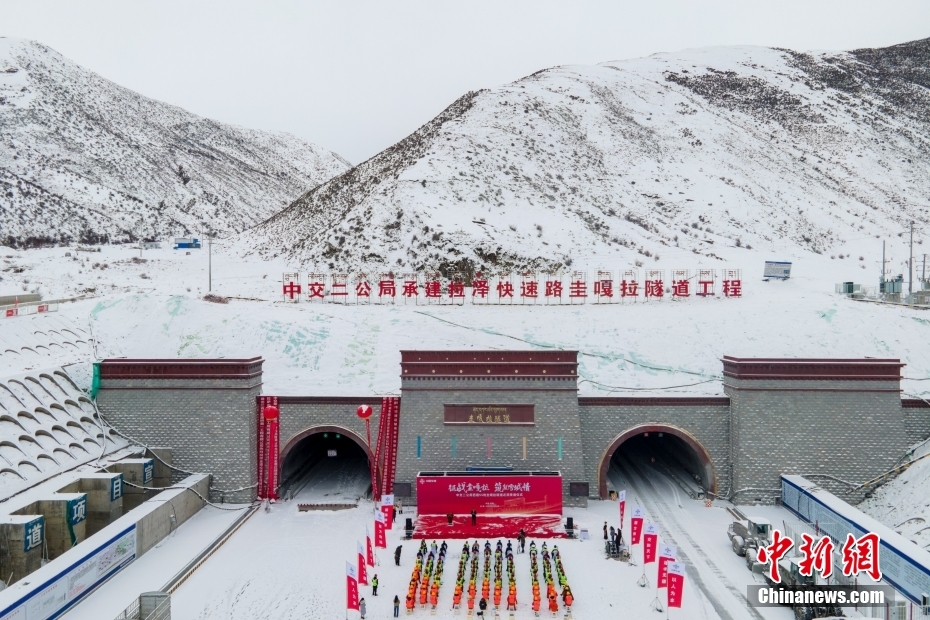 3月28日,西藏S5線拉薩至澤當(dāng)快速通道項(xiàng)目控制性工程圭嘎拉隧道左洞實(shí)現(xiàn)貫通。圖為西藏圭嘎拉隧道左洞貫通儀式現(xiàn)場(chǎng)。(無人機(jī)畫面)
