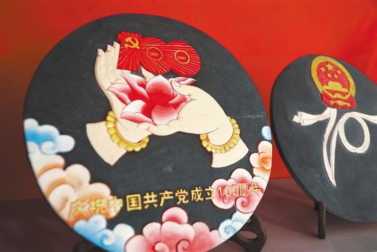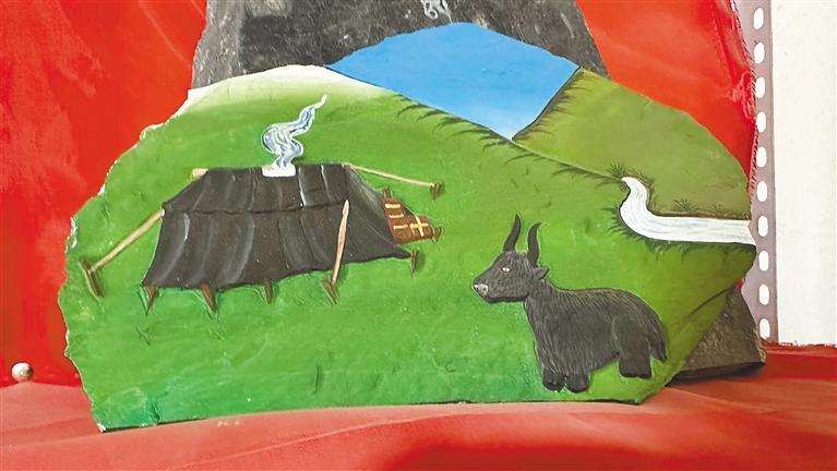 “我們首先要選好一塊石頭,根據(jù)它的形狀和質(zhì)地來(lái)決定刻成一幅什么樣的作品,然后再畫(huà)出作品的輪廓進(jìn)行雕刻,最后一步則為上色?!鄙V懿湃薀崆榈貛覀儏⒂^(guān)他的工作室,“慶祝中國(guó)共產(chǎn)黨成立100周年”“牧家生活”“扎西德勒”“白海螺”“和氣四瑞像”……每一幅作品活靈活現(xiàn)在大大小小石板上,栩栩如生、惟妙惟肖,堅(jiān)硬的石頭在他出神入化的雕工下竟變得柔軟,又不失力量和美感。