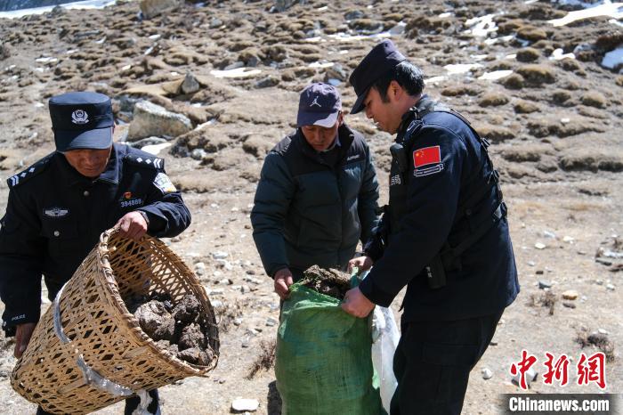 圖為4月6日,公漳浦執(zhí)勤民輔警等在草場收集風(fēng)干牦牛糞,當(dāng)作取暖燃料?!〗w波 攝