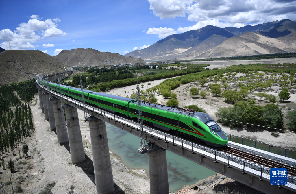 這是行駛在西藏山南市境內(nèi)的復(fù)興號(hào)列車(chē)。(2022年6月22日攝)。新華社記者 覺(jué)果 攝