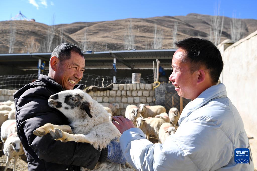 西卡學(xué)村養(yǎng)殖合作社負(fù)責(zé)人邊覺(jué)(左)在向西卡學(xué)村黨總支第一書(shū)記兼駐村工作隊(duì)副隊(duì)長(zhǎng)李德林介紹綿羊養(yǎng)殖及銷(xiāo)售情況(4月5日攝)。新華社記者 張汝鋒 攝