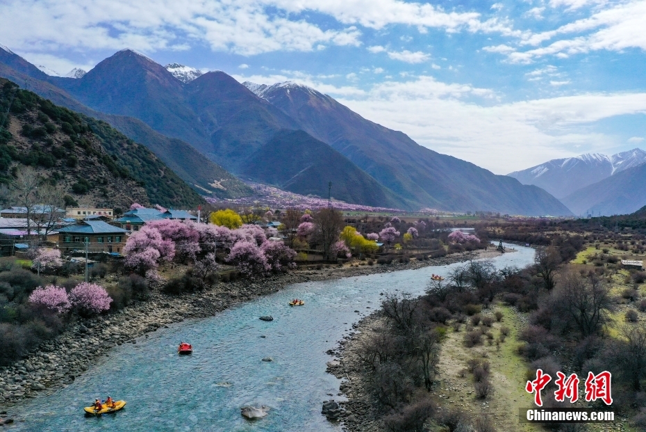 圖為激流漂流筏追逐賽比賽現(xiàn)場。(無人機照片)中新社記者 貢嘎來松 攝
