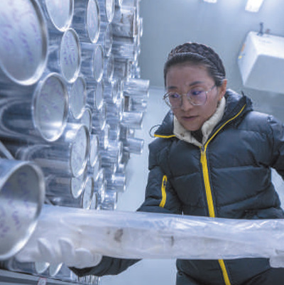 德吉在冰芯庫(kù)查看冰芯樣本。記者 徐馭堯攝
