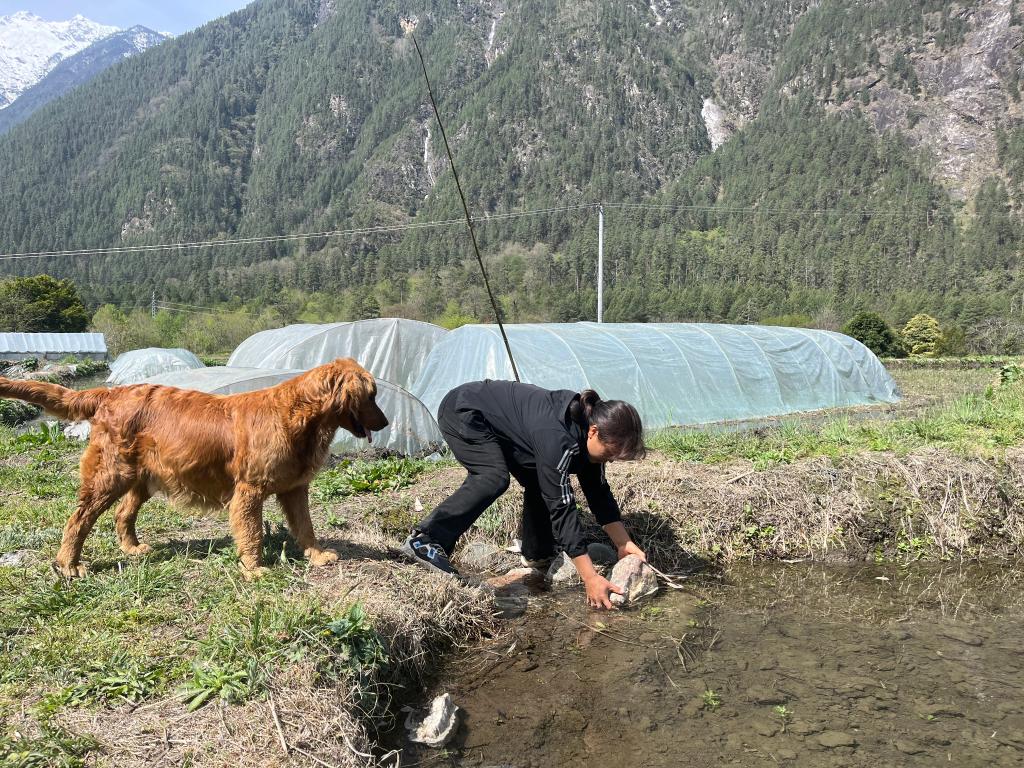 安陽麗正在清理水稻田里的石頭(4月15日攝)。新華社記者王澤昊 攝