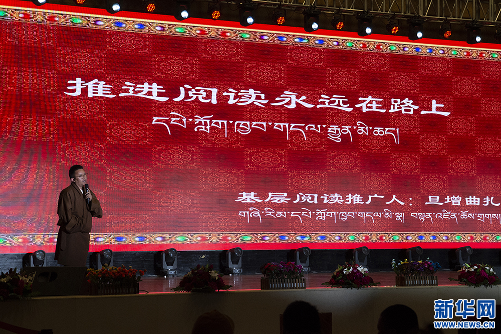 4月23日,基層閱讀推廣人旦增曲扎在展示基層閱讀推廣成果。新華網 旦增努布 攝