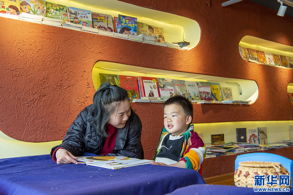 4月23日,一對母子在書店里閱讀繪本。新華網 旦增努布 攝